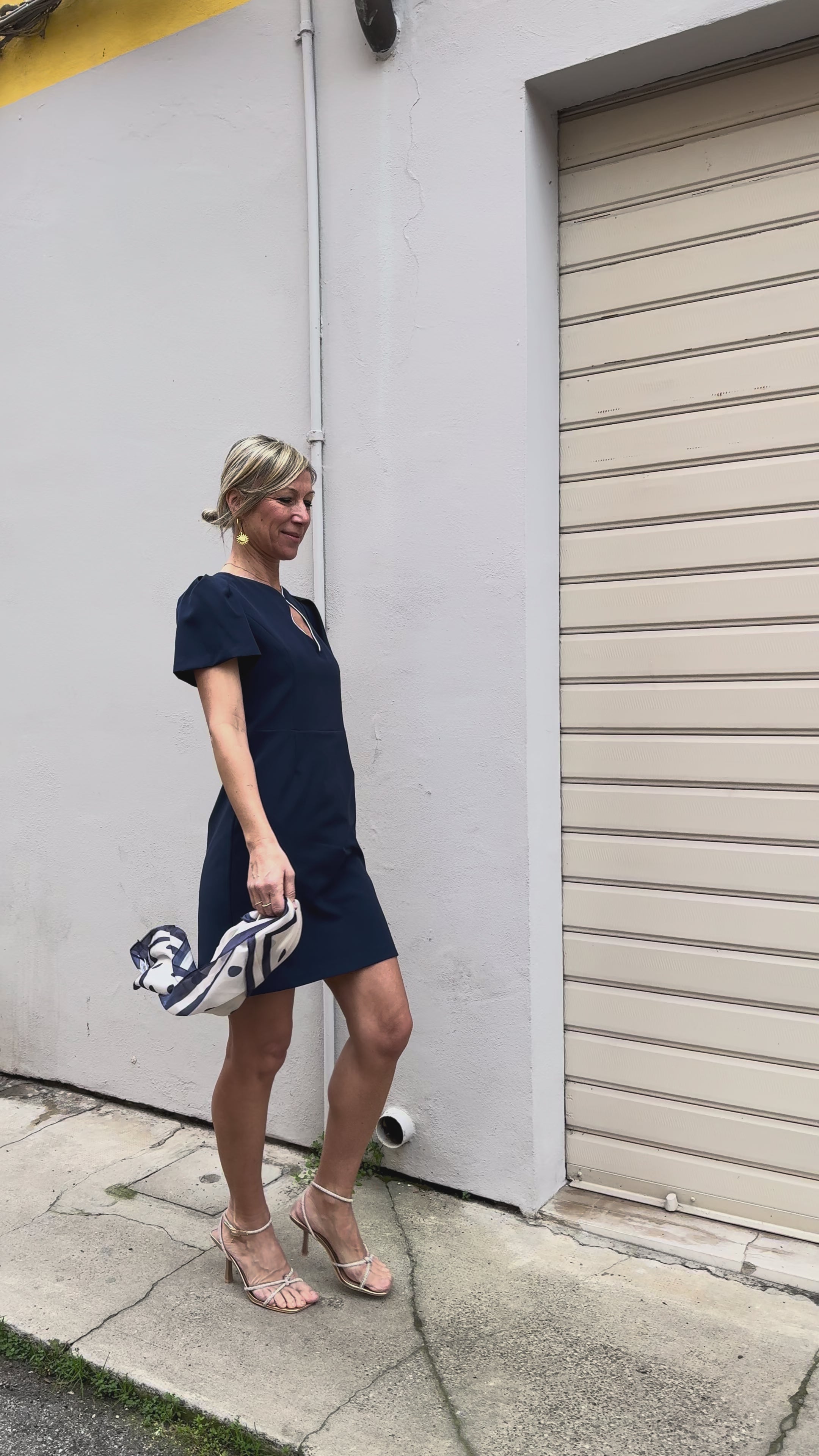 Abito elegante con scollo frontale caratteristico e profili a contrasto che definiscono la silhouette. Maniche corte a sbuffo per un tocco romantico e sofisticato. Taglio in vita che valorizza la figura, completato da zip invisibile sul retro per una chiusura impeccabile. Un capo versatile perfetto per occasioni speciali e look quotidiani raffinati.